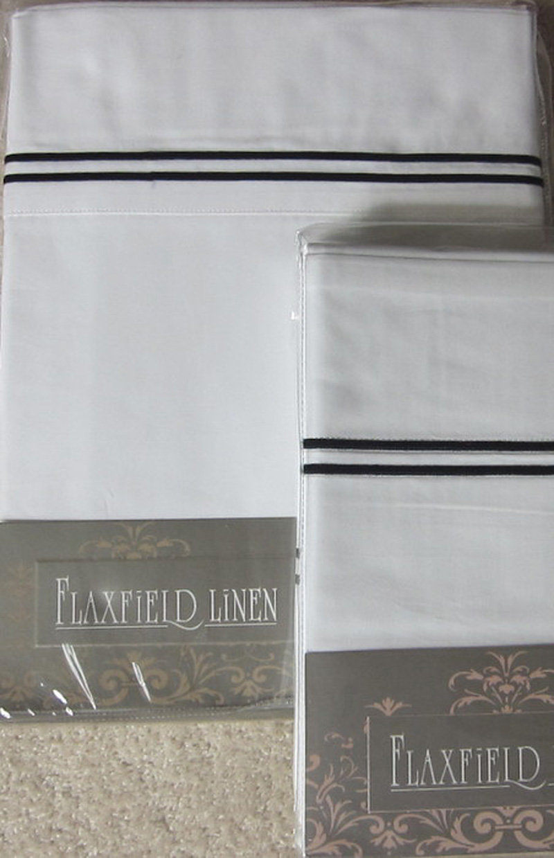 This black and white flat and fitted Queen sheet set and 2 pillow cases are in 400 Tc 100% cotton sateen.