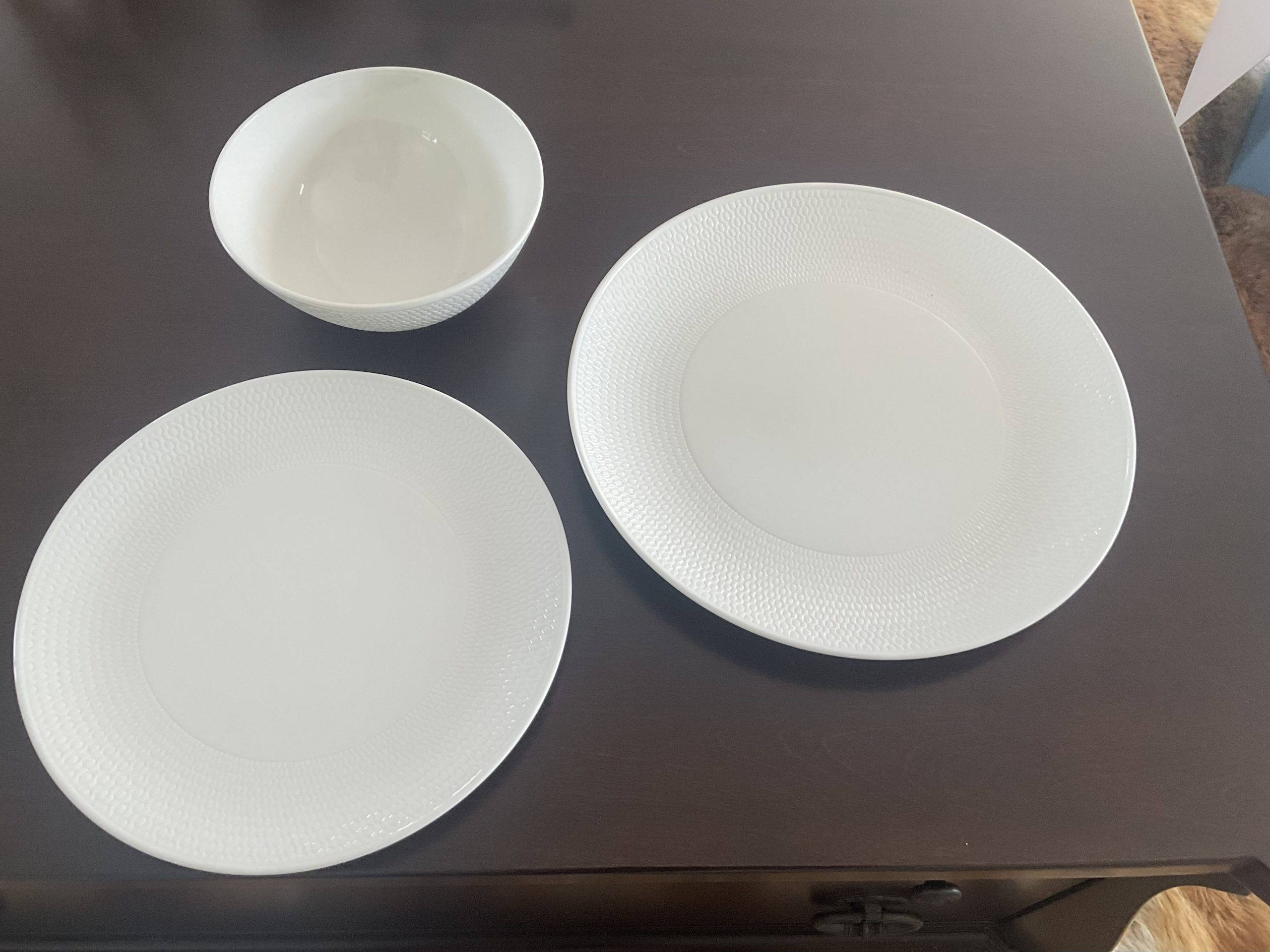 This delightful white china 12 piece set by Wedgwood is elegant, has a very subtle gorgeous self pattern around the outside! 4 entree plates 4 dinner plates 4 bowls …extras can be ordered!