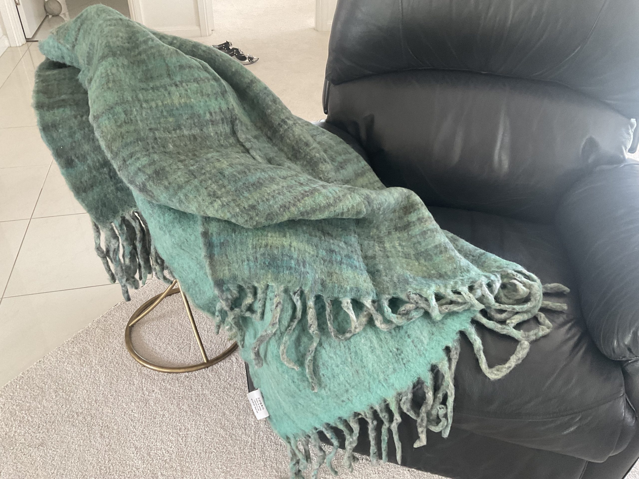 130×200 cms this gorgeous luxurious throw is 90% wool perfect for the arm of the chair to pull over your knees or an add for your bed on those cool nights !